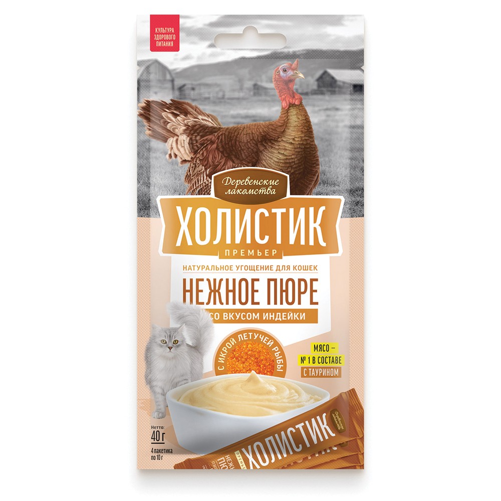 На данной странице размещены фото, описание и состав, а также отзывы о "Лакомство для кошек ДЕРЕВЕНСКИЕ ЛАКОМСТВА Премьер нежное пюре со вкус.индей.с икрой летуч.рыбы 4х10г".
