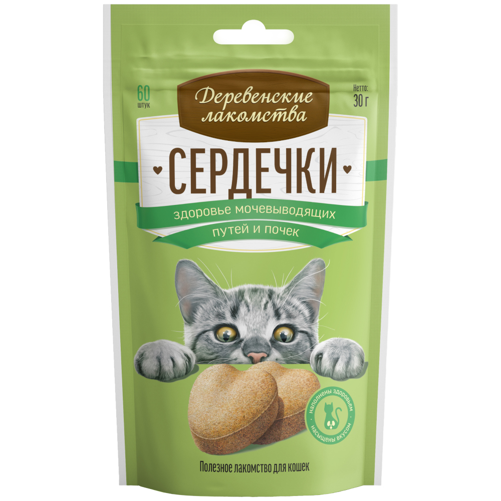 На данной странице размещены фото, описание и состав, а также отзывы о "Лакомство для кошек ДЕРЕВЕНСКИЕ ЛАКОМСТВА Сердечки здоровье мочевыводящих путей и почек 30г".