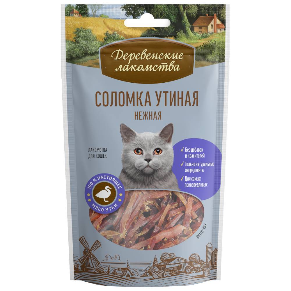На данной странице размещены фото, описание и состав, а также отзывы о "Лакомство для кошек ДЕРЕВЕНСКИЕ ЛАКОМСТВА Соломка утиная нежная 45г".