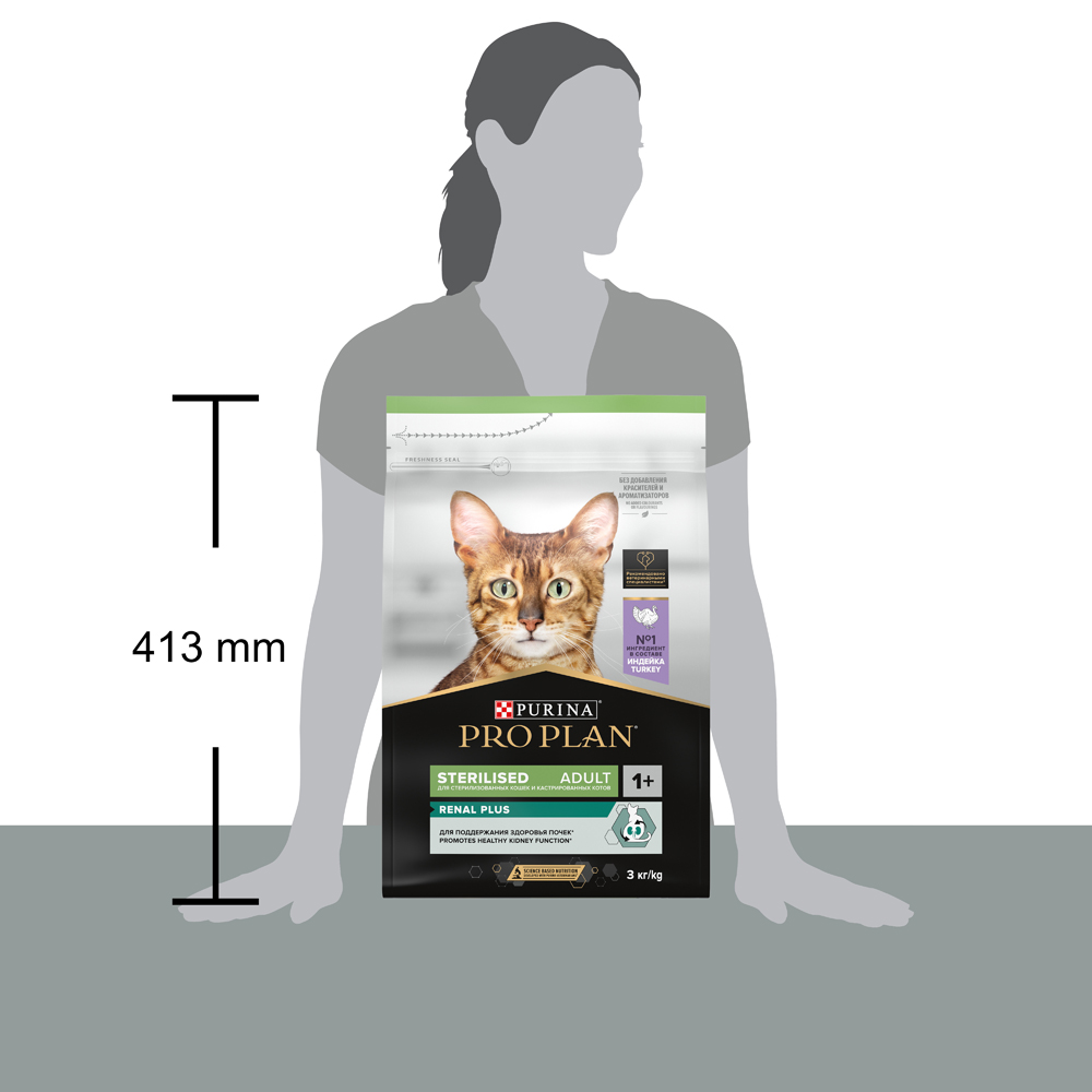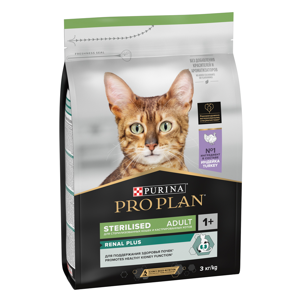 На данной странице размещены фото, описание и состав, а также отзывы о "ProPlan Sterilised Renal Plus Сухой корм для поддержания здоровья почек у стерилизованных кошек, с высоким содержанием индейки, 3 кг".