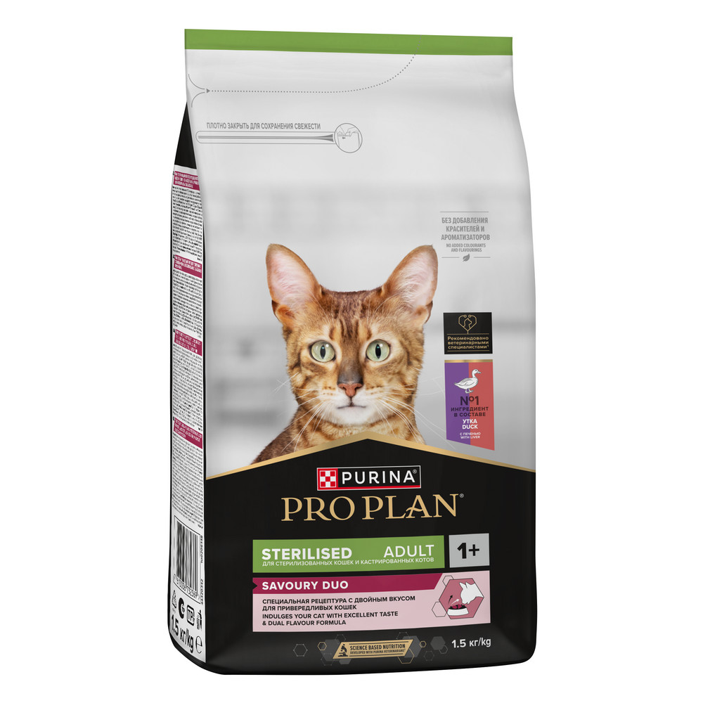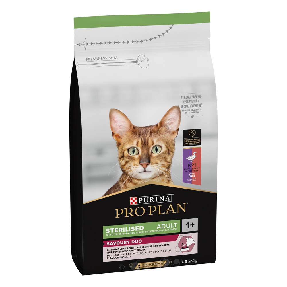 На данной странице размещены фото, описание и состав, а также отзывы о "ProPlan Sterilised Savoury Duo Сухой корм для взрослых стерилизованных кошек и кастрированных котов привередливых в еде, с уткой и с печенью, 1,5 кг".