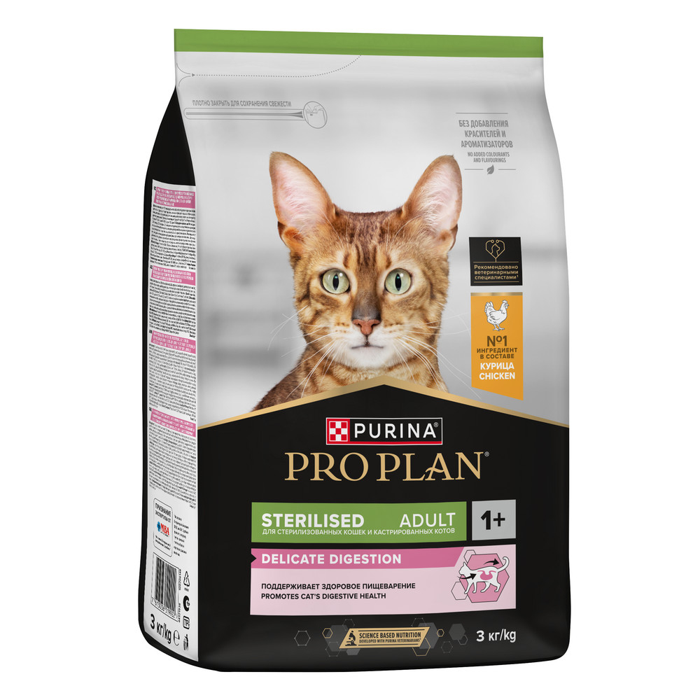 На данной странице размещены фото, описание и состав, а также отзывы о "ProPlan Sterilised Delicate Digestion Сухой корм для взрослых стерилизованных кошек и кастрированных котов с чувствительным пищеварением, с курицей, 3 кг".