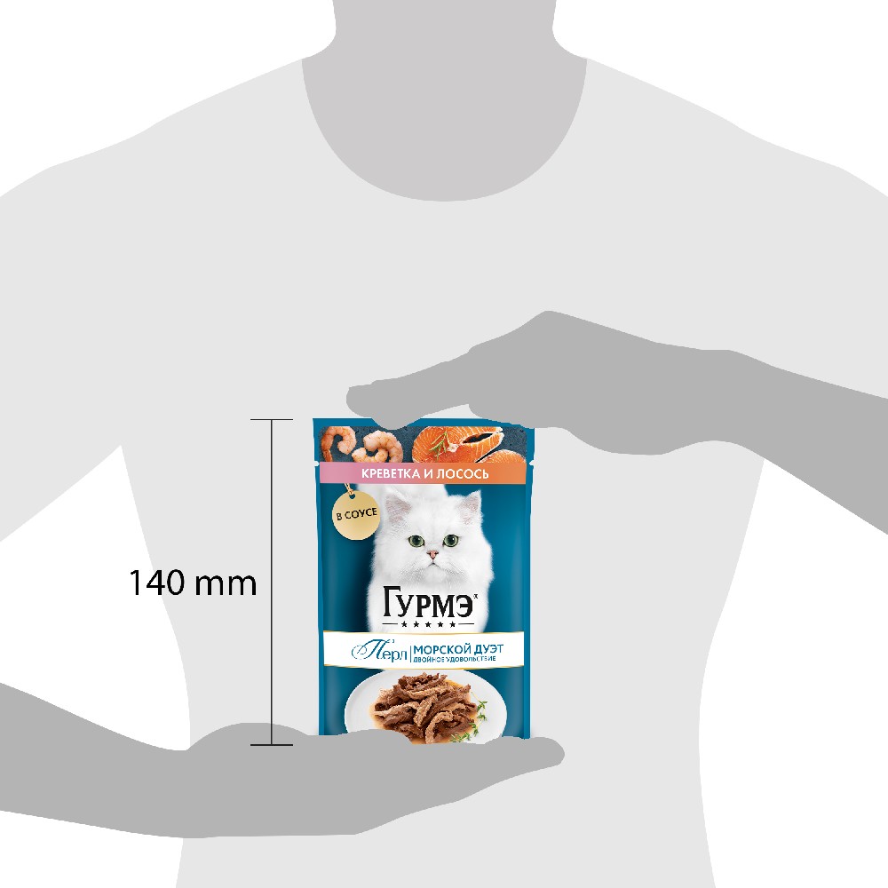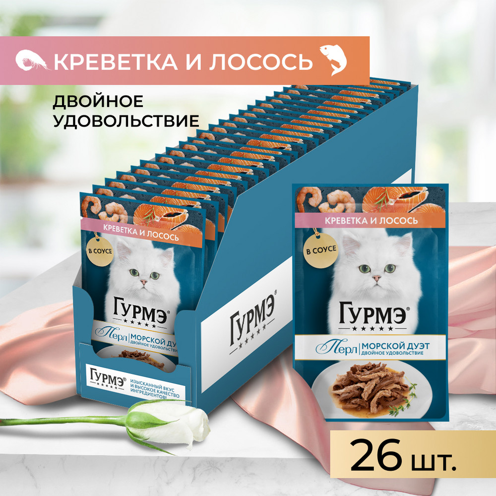 На данной странице размещены фото, описание и состав, а также отзывы о "Gourmet Влажный корм (пауч) для взрослых кошек Перл Морской дуэт, с креветкой и лососем в соусе, 75 гр.".