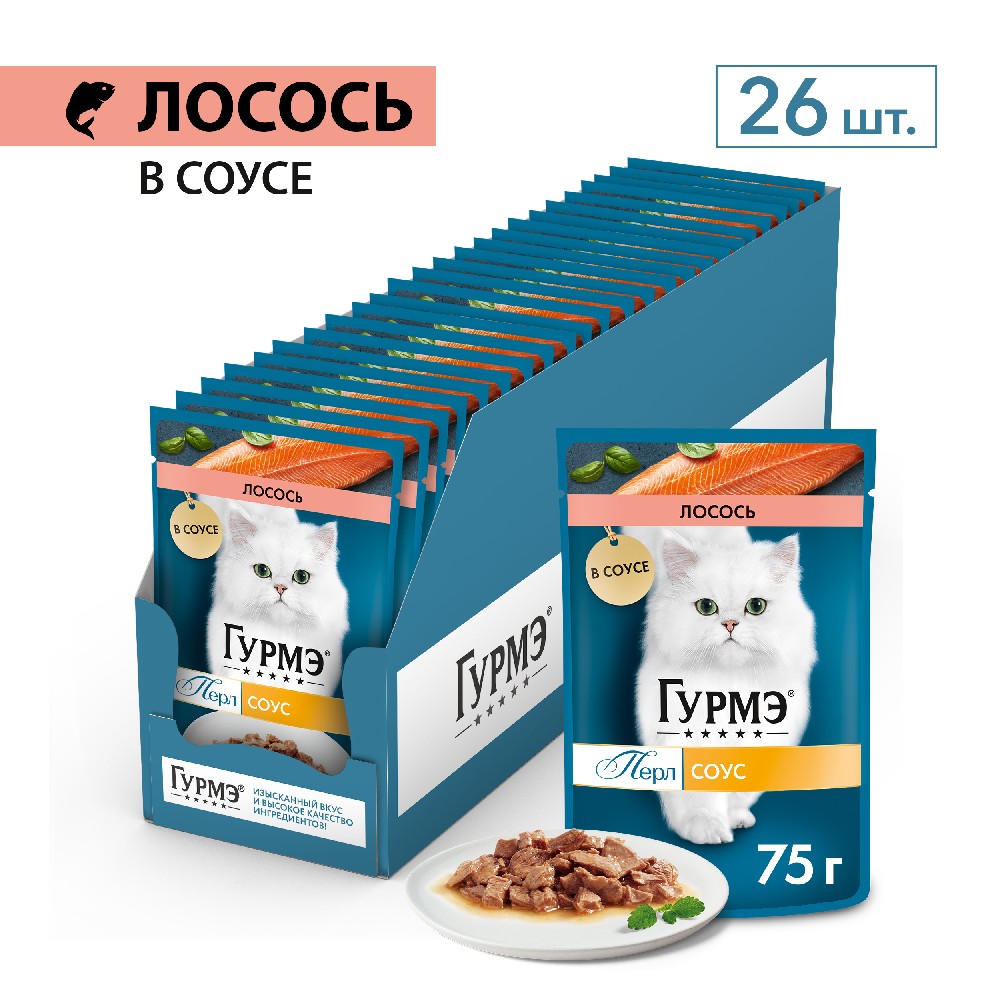 На данной странице размещены фото, описание и состав, а также отзывы о "Gourmet Влажный корм (пауч) для взрослых кошек Перл Нежное филе, с лососем в соусе, 75 гр.".