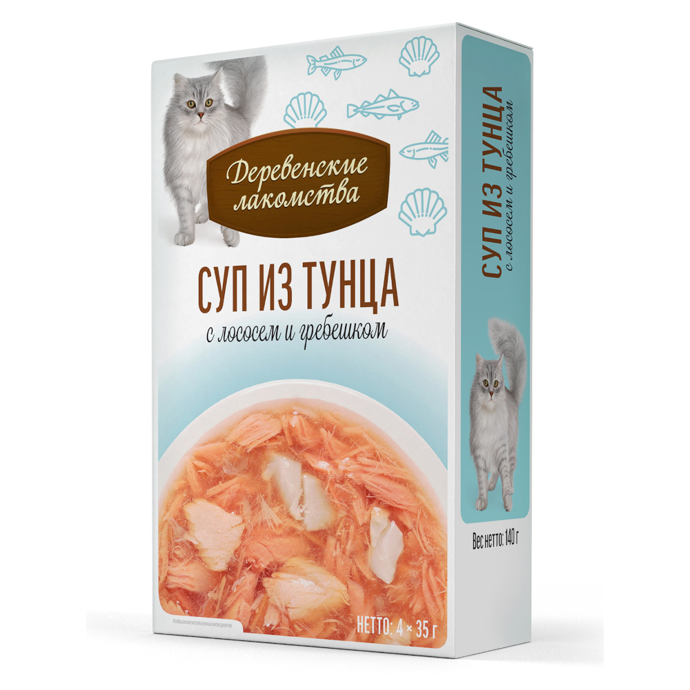 На данной странице размещены фото, описание и состав, а также отзывы о "Корм для кошек ДЕРЕВЕНСКИЕ ЛАКОМСТВА Суп из тунца с лососем и гребешком пауч 35гх4шт".