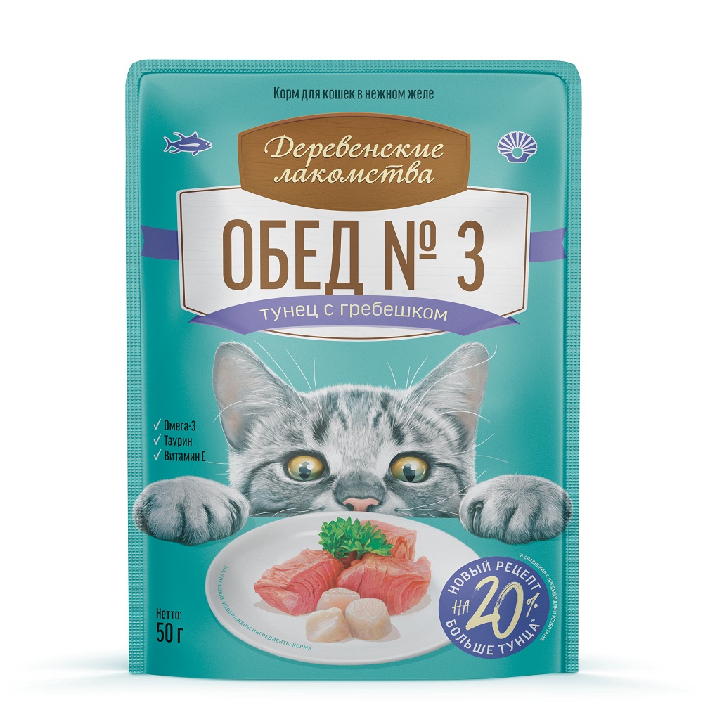 На данной странице размещены фото, описание и состав, а также отзывы о "Корм для кошек ДЕРЕВЕНСКИЕ ЛАКОМСТВА Тунец с гребешком пауч 50г".