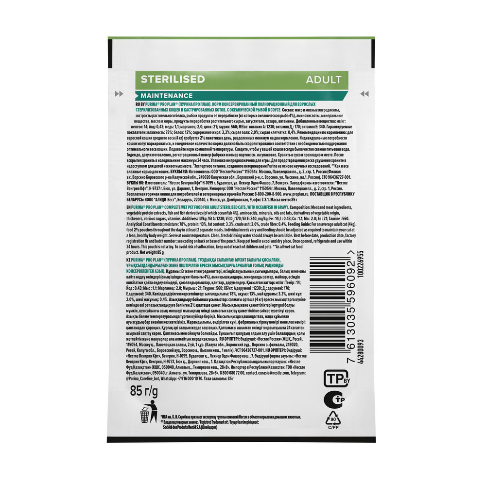 На данной странице размещены фото, описание и состав, а также отзывы о "ProPlan Sterilised Maintenance Влажный корм (пауч) для взрослых стерилизованных кошек и кастрированных котов, с океанической рыбой в соусе, 85 гр.".