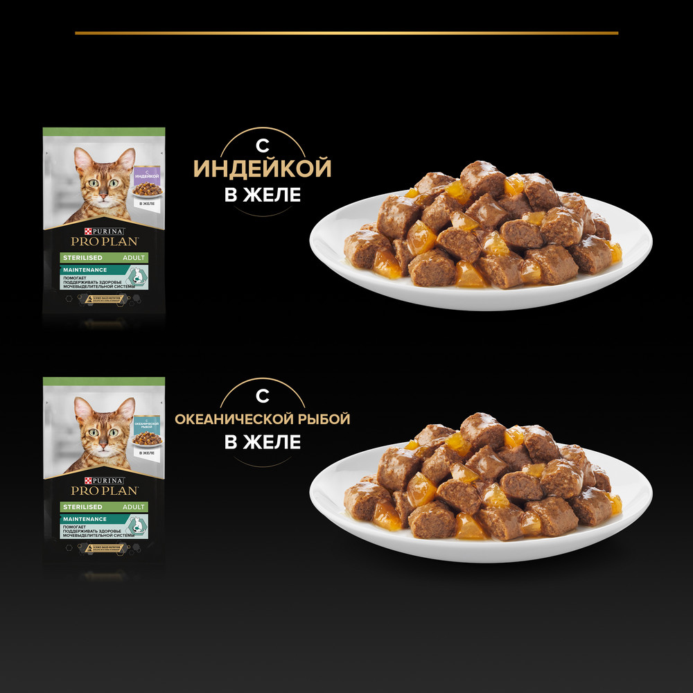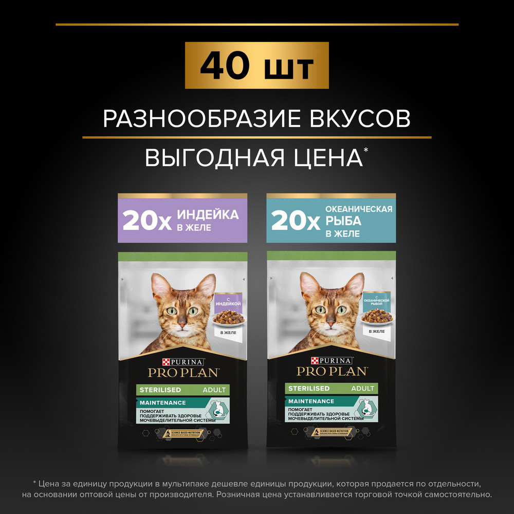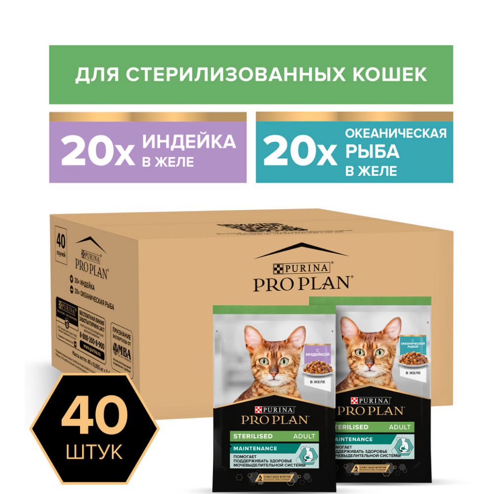 На данной странице размещены фото, описание и состав, а также отзывы о "ProPlan Sterilised Maintenance Влажный корм (мультипак) для взрослых стерилизованных кошек, с индейкой в желе, океанической рыбой в желе, 40х85 гр.".