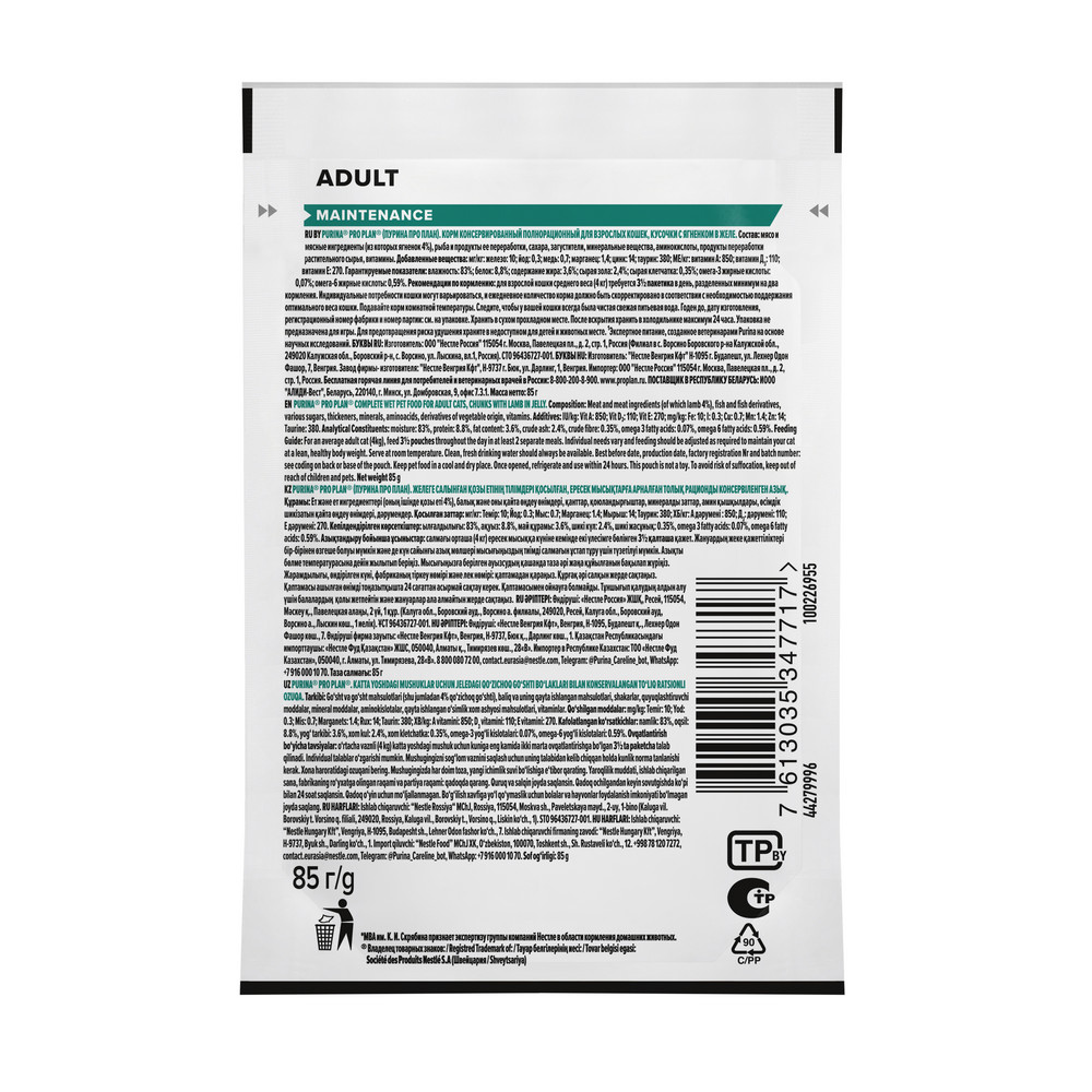 На данной странице размещены фото, описание и состав, а также отзывы о "ProPlan Maintenance Влажный корм (пауч) для взрослых кошек, с ягненком в желе, 85 гр.".