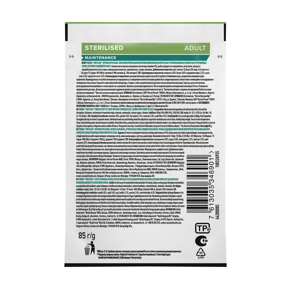 На данной странице размещены фото, описание и состав, а также отзывы о "ProPlan Sterilised Maintenance Влажный корм (пауч) для взрослых стерилизованных кошек и кастрированных котов, с индейкой в желе, 85 гр.".