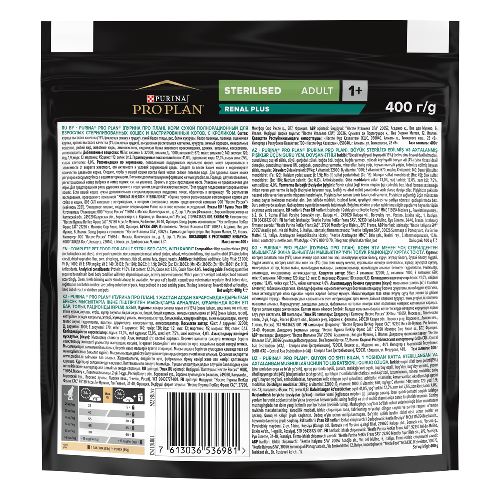 На данной странице размещены фото, описание и состав, а также отзывы о "ProPlan Sterilised Adult Renal Plus Сухой корм для поддержания здоровья почек у стерилизованных кошек, с кроликом, 400 гр.".