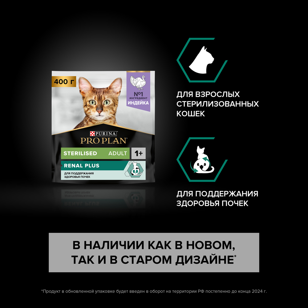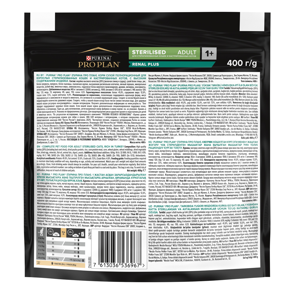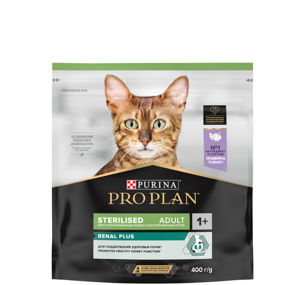На данной странице размещены фото, описание и состав, а также отзывы о "ProPlan Sterilised Adult Renal Plus Сухой корм для поддержания здоровья почек у стерилизованных кошек, с высоким содержанием индейки, 400 гр.".