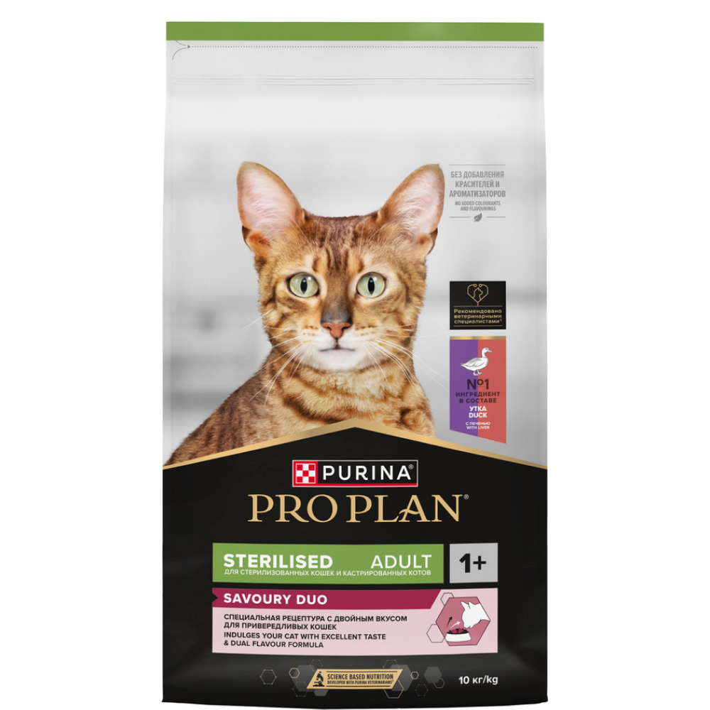 На данной странице размещены фото, описание и состав, а также отзывы о "ProPlan Sterilised Savoury Duo Сухой корм для взрослых стерилизованных кошек и кастрированных котов привередливых в еде, с уткой и с печенью, 10 кг".