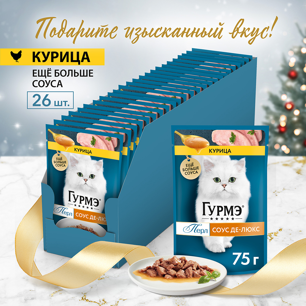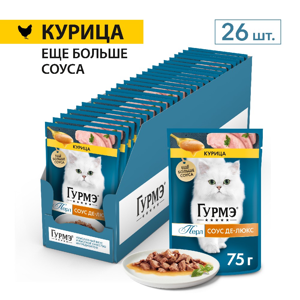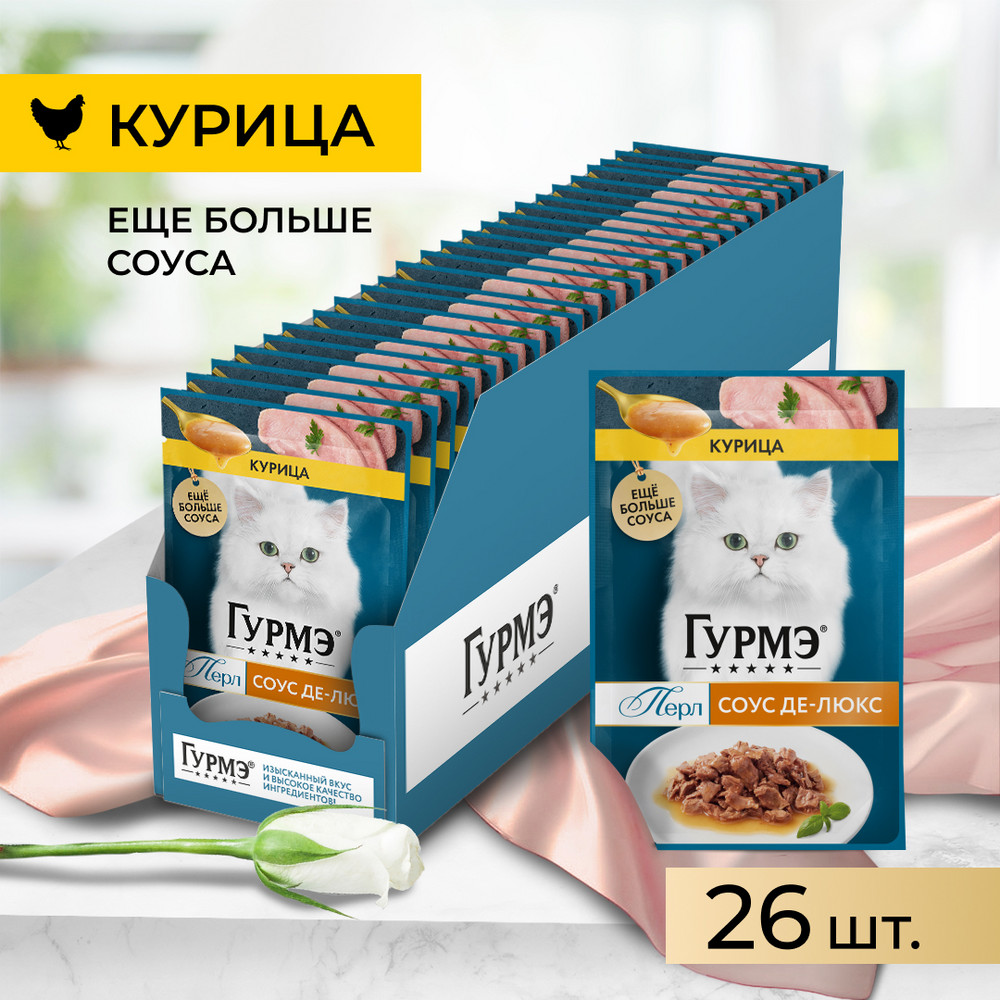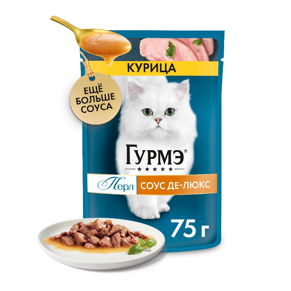 На данной странице размещены фото, описание и состав, а также отзывы о "Gourmet Влажный корм (пауч) для взрослых кошек Перл Соус Де-люкс, с курицей в соусе, 75 гр.".