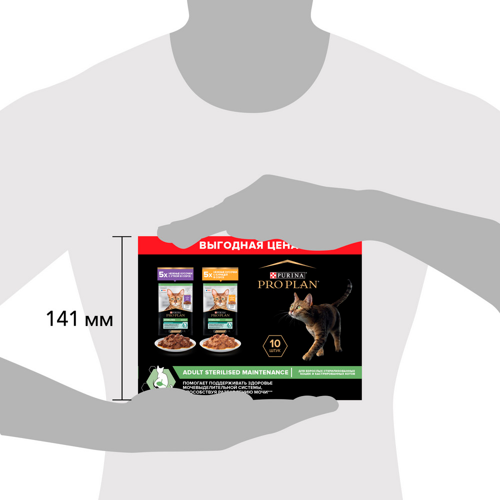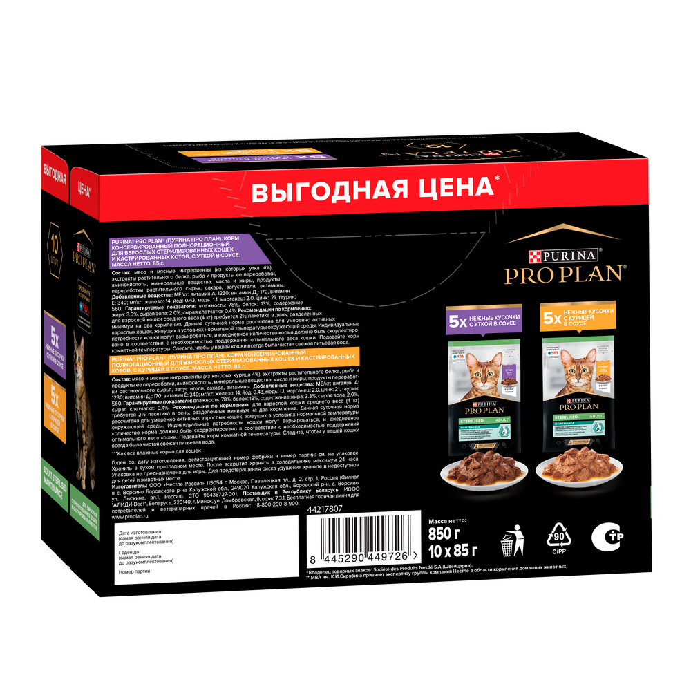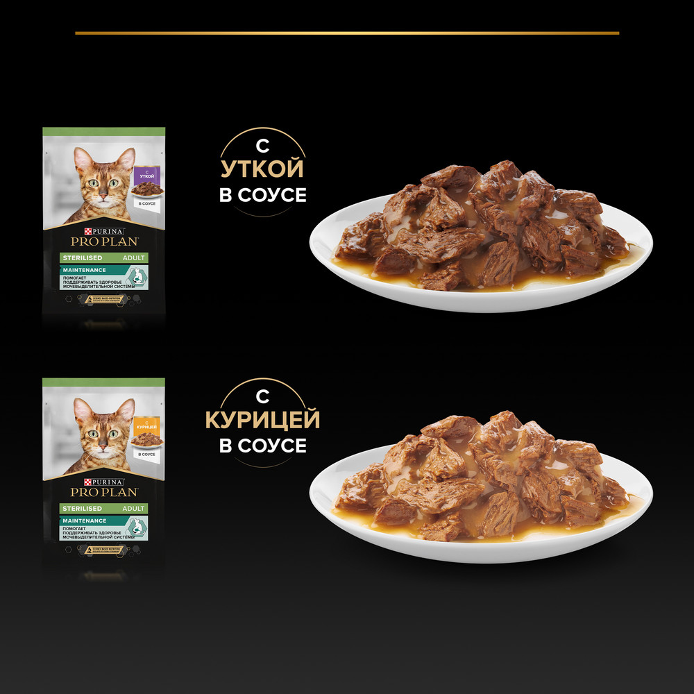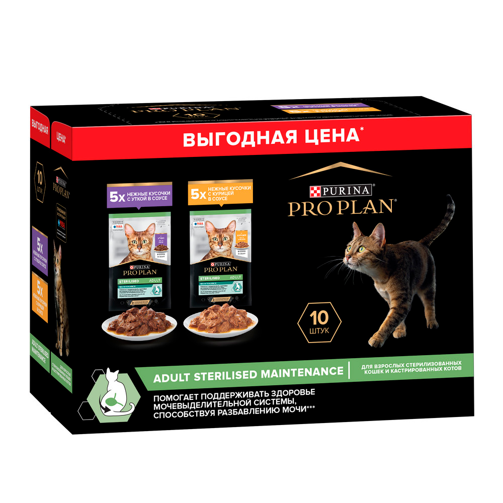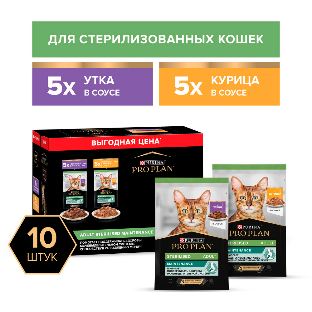 На данной странице размещены фото, описание и состав, а также отзывы о "ProPlan Sterilised Maintenance Влажный корм (мультипак) для взрослых стерилизованных кошек, с уткой в соусе, курицей в соусе, 10х85 гр.".