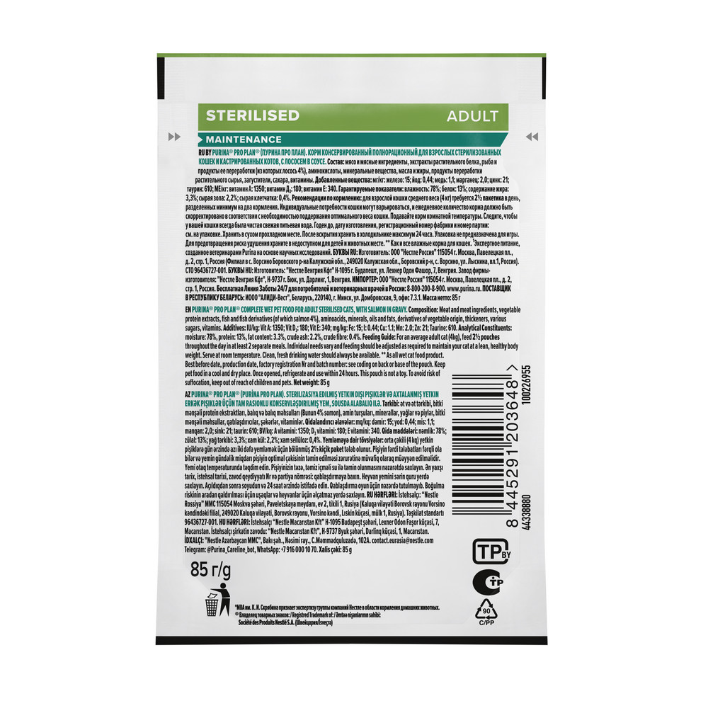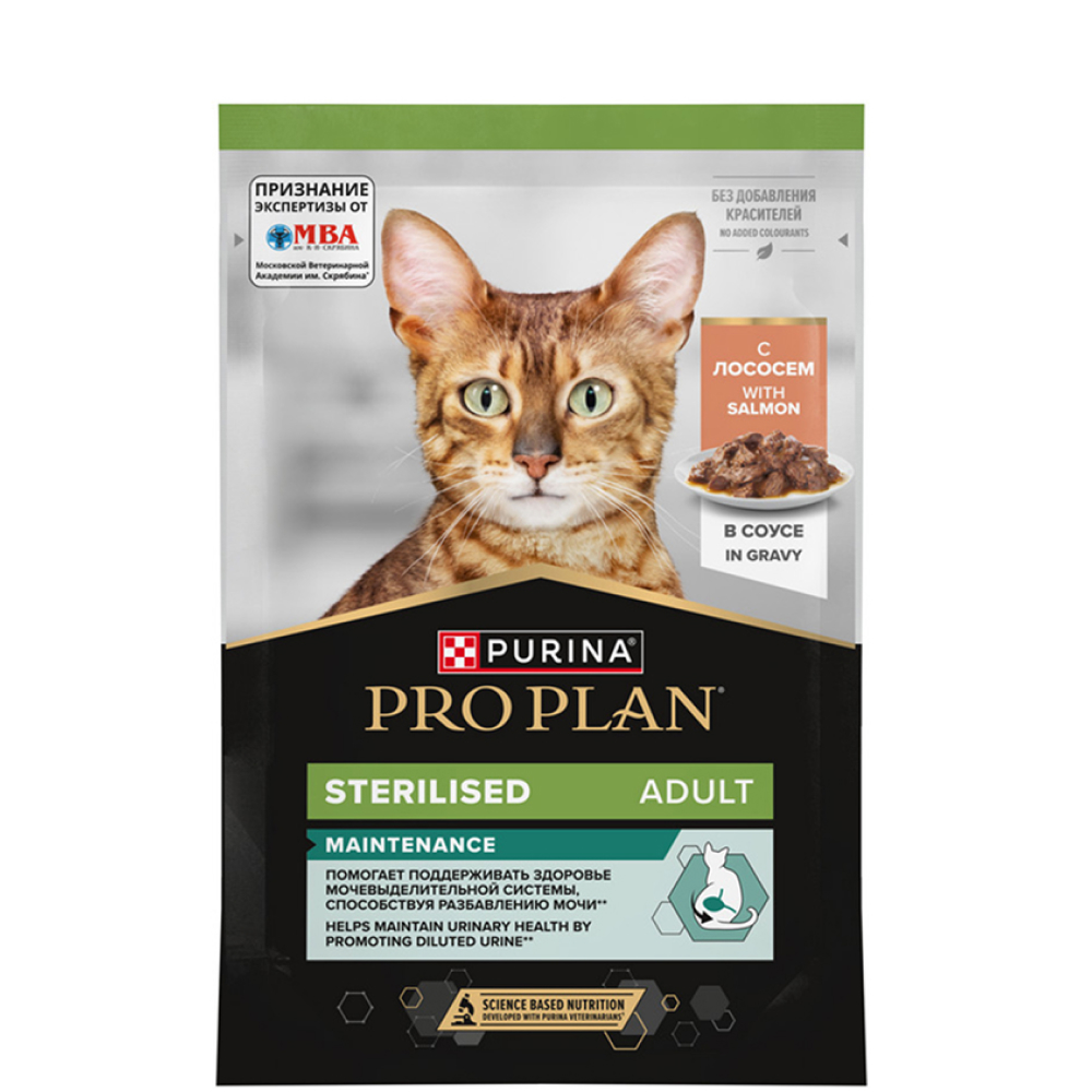 На данной странице размещены фото, описание и состав, а также отзывы о "ProPlan Sterilised MAINTENANCE Влажный корм (пауч) для взрослых стерилизованных кошек, с лососем в соусе, 85 гр.".