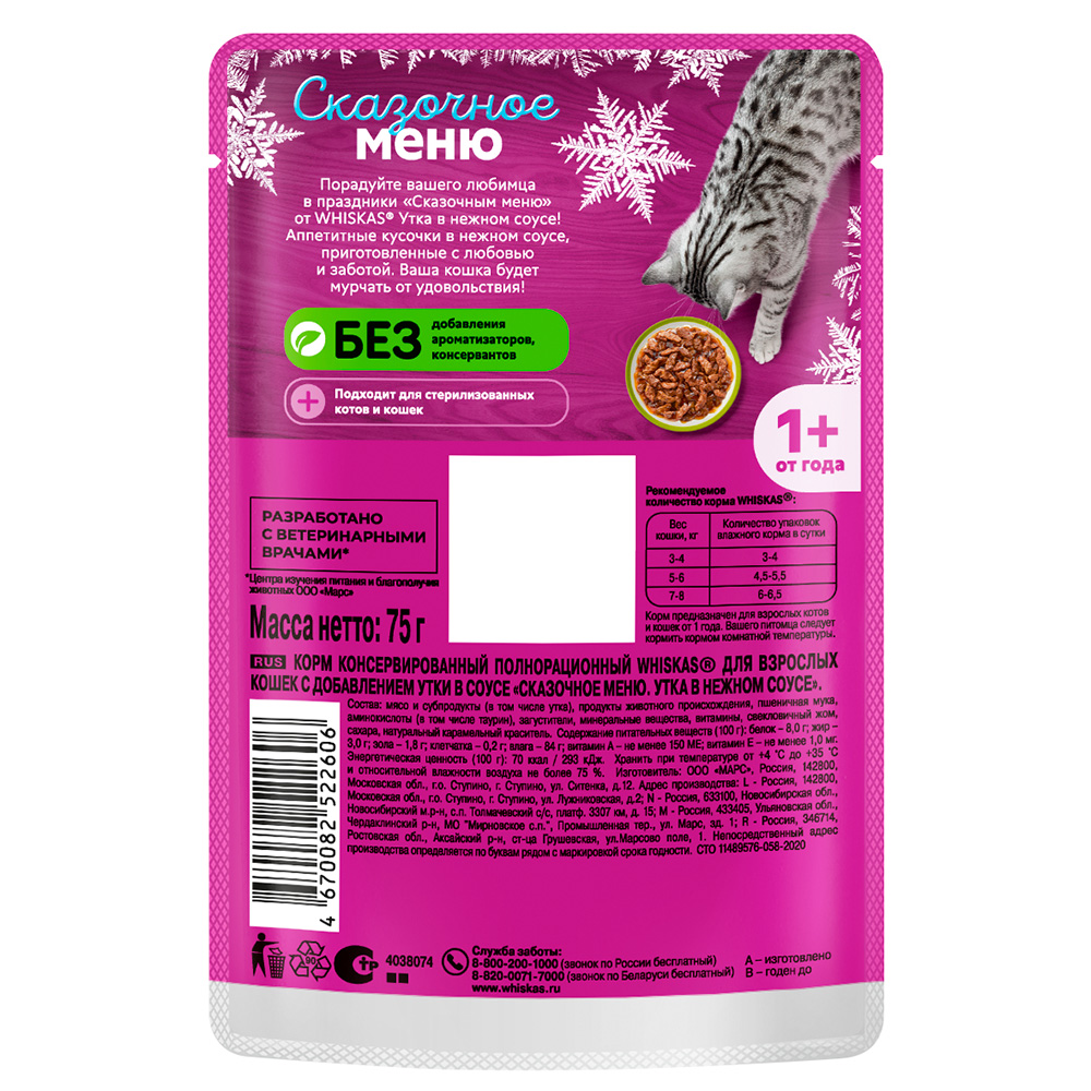 ΠΠ΅ΡΠ΅ΠΉΡΠΈ ΠΊ ΠΏΠΎΠΊΡΠΏΠΊΠ°ΠΌΠΡΠΏΠΈΡΡ "Whiskas ΠΠ»Π°ΠΆΠ½ΡΠΉ ΠΊΠΎΡΠΌ (ΠΏΠ°ΡΡ) Π΄Π»Ρ ΠΊΠΎΡΠ΅ΠΊ Π‘ΠΊΠ°Π·ΠΎΡΠ½ΠΎΠ΅ ΠΌΠ΅Π½Ρ, ΡΡΠΊΠ° Π² Π½Π΅ΠΆΠ½ΠΎΠΌ ΡΠΎΡΡΠ΅, 75 Π³Ρ. 4670082522606" ΠΏΡΠΎΠΈΠ·Π²ΠΎΠ΄ΠΈΡΠ΅Π»Ρ "Whiskas", ΠΏΠΎ ΡΠ΅Π½Π΅ 35 β½ Π² Π·ΠΎΠΎΠΌΠ°Π³Π°Π·ΠΈΠ½Π΅ "Fraulen" Π² ΠΌΠ°Π³Π°Π·ΠΈΠ½Π΅ ΠΈΠ»ΠΈ Ρ Π΄ΠΎΡΡΠ°Π²ΠΊΠΎΠΉ Π½Π° Π΄ΠΎΠΌ Π² Π³ΠΎΡΠΎΠ΄Π΅ ΠΠΎΡΠΊΠ²Π°.