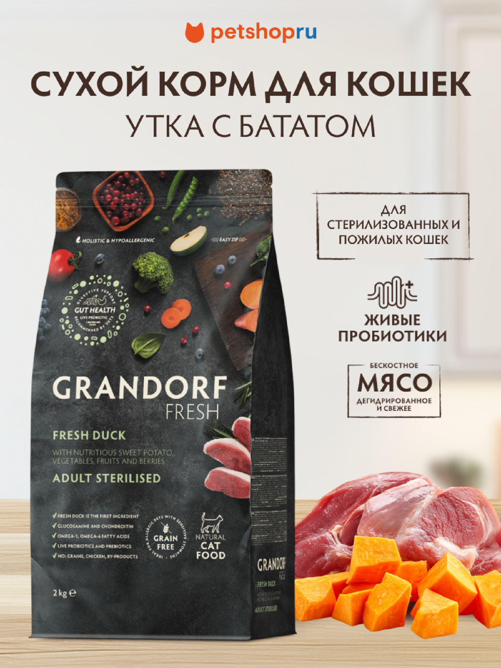 Благодаря беззерновому и безглютеновому составу корма Grandorf FRESH легко усваиваются и отлично подходят для животных с чувствительным пищеварением или пищевой аллергией.