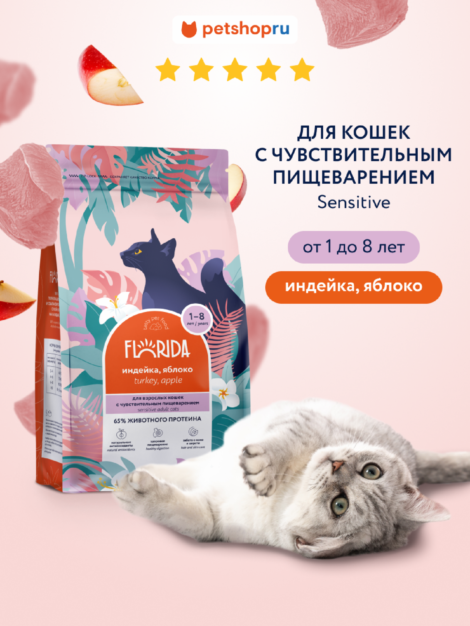 Π₯олистики FLORIDA Π‘ΡƒΡ…ΠΎΠΉ ΠΊΠΎΡ€ΠΌ для кошСк с Ρ‡ΡƒΠ²ΡΡ‚Π²ΠΈΡ‚Π΅Π»ΡŒΠ½Ρ‹ΠΌ ΠΏΠΈΡ‰Π΅Π²Π°Ρ€Π΅Π½ΠΈΠ΅ΠΌ с ΠΈΠ½Π΄Π΅ΠΉΠΊΠΎΠΉ ΠΈ яблоком, Sensible Turkey, 400 Π³ (400 Π³)