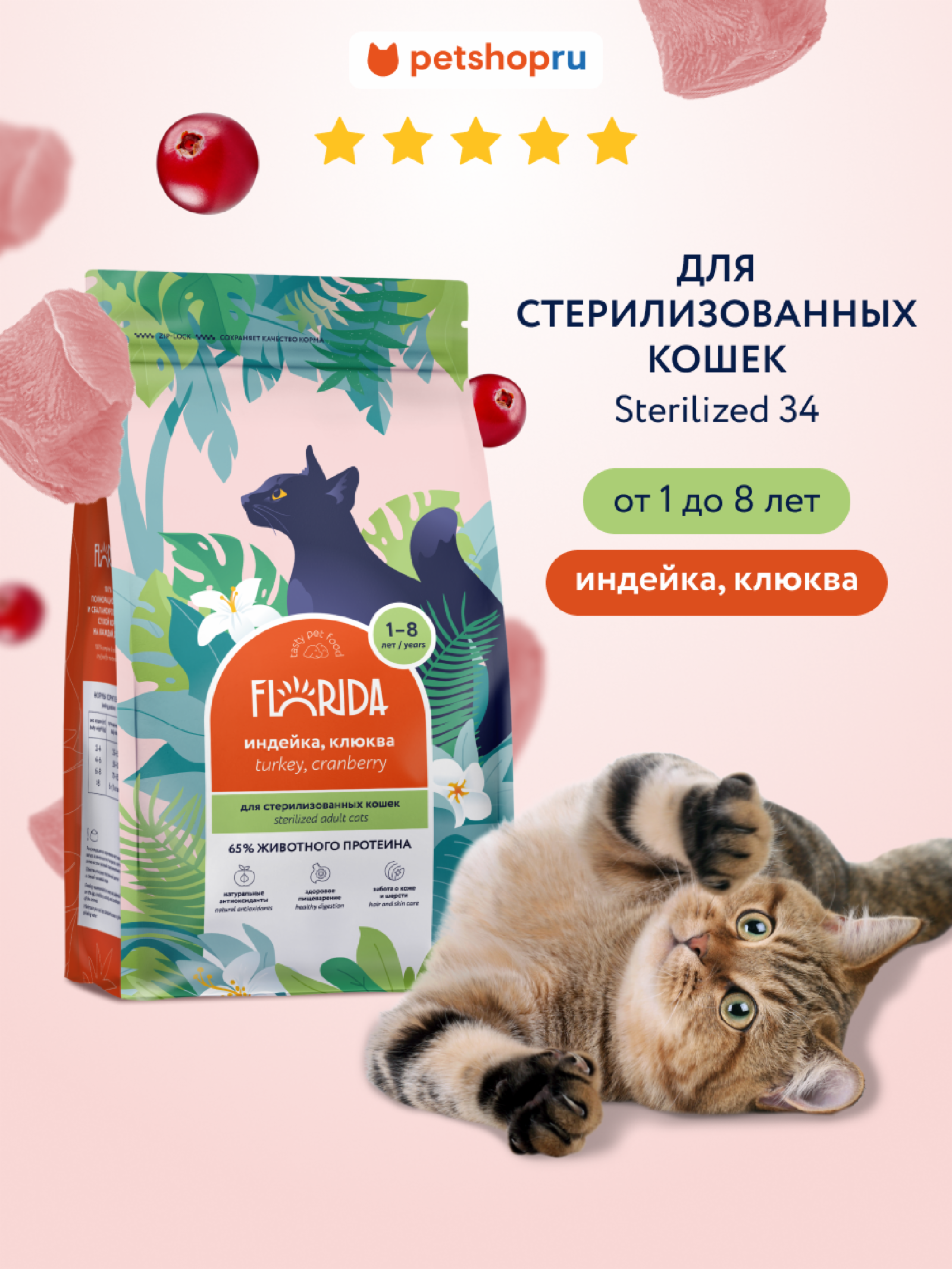 Π₯олистики FLORIDA Π‘ΡƒΡ…ΠΎΠΉ ΠΊΠΎΡ€ΠΌ для стСрилизованных кошСк с ΠΈΠ½Π΄Π΅ΠΉΠΊΠΎΠΉ ΠΈ клюквой, Sterilised 34 Turkey, 1,5 ΠΊΠ³ (1.5 ΠΊΠ³)