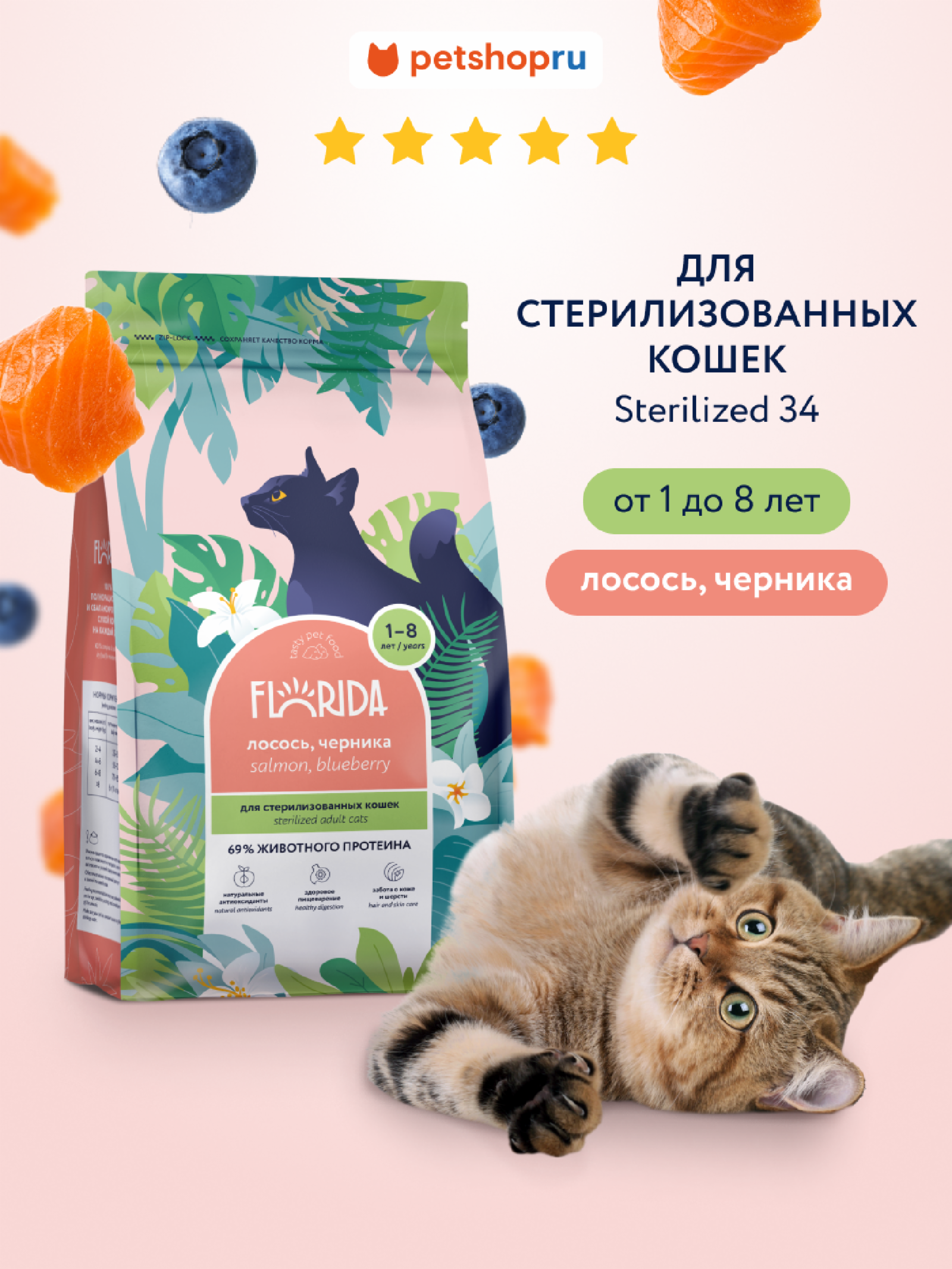 Π₯олистики FLORIDA Π‘ΡƒΡ…ΠΎΠΉ ΠΊΠΎΡ€ΠΌ для стСрилизованных кошСк с лососСм ΠΈ Ρ‡Π΅Ρ€Π½ΠΈΠΊΠΎΠΉ, Sterilised 34 Salmon, 400 Π³ (400 Π³)