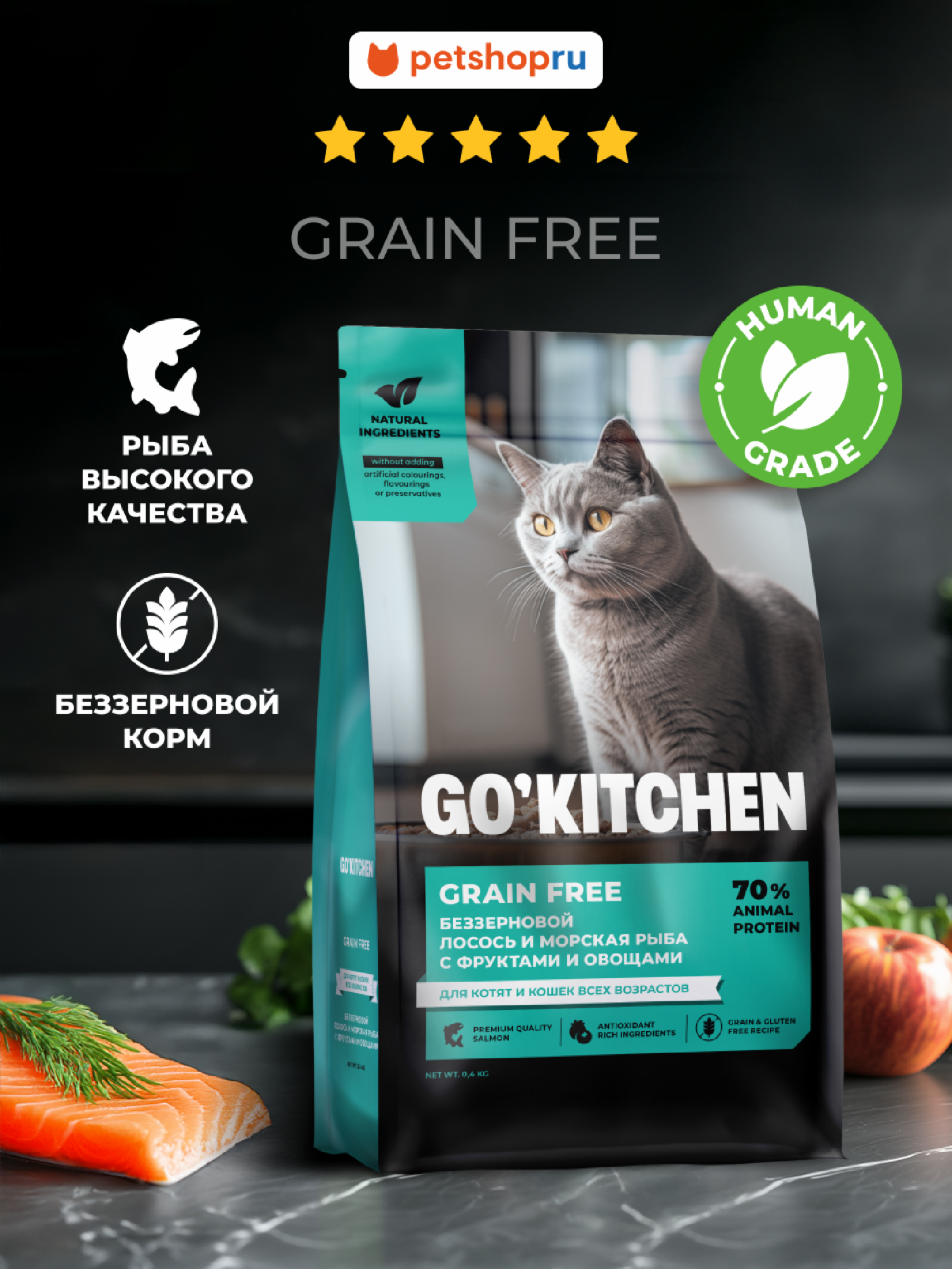 GO'KITCHEN GRAIN FREE Salmon&Seafish - Π±Π΅Π·Π·Π΅ΡΠ½ΠΎΠ²ΠΎΠΉ ΠΊΠΎΡΠΌ, ΡΠ°Π·ΡΠ°Π±ΠΎΡΠ°Π½Π½ΡΠΉ Ρ ΡΡΠ΅ΡΠΎΠΌ ΠΏΠΎΡΡΠ΅Π±Π½ΠΎΡΡΠ΅ΠΉ ΠΊΠΎΡΡΡ ΠΈ ΠΊΠΎΡΠ΅ΠΊ Π²ΡΠ΅Ρ