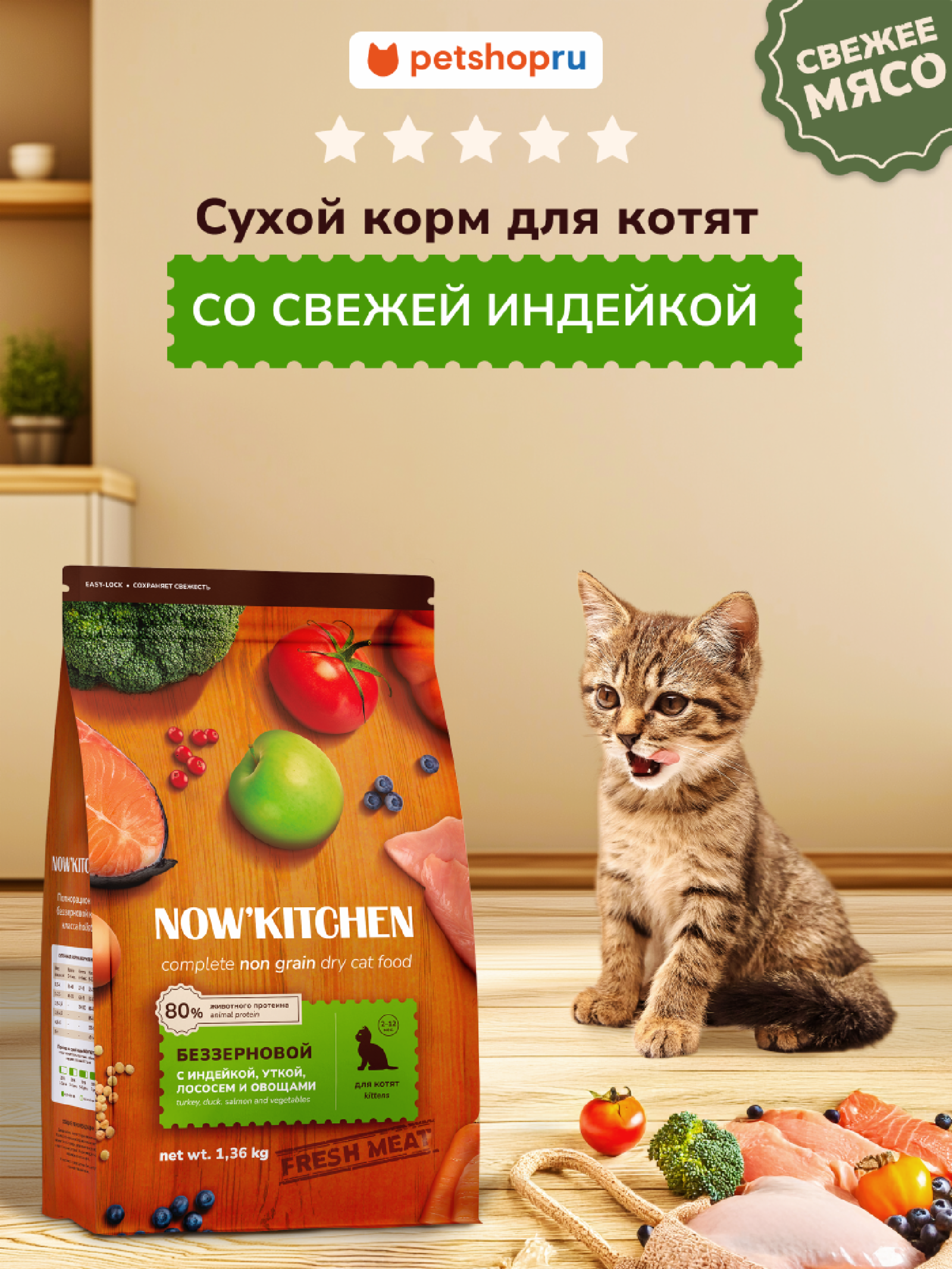 Π₯олистики NOW'KITCHEN Fresh Π±Π΅Π·Π·Π΅Ρ€Π½ΠΎΠ²ΠΎΠΉ ΠΊΠΎΡ€ΠΌ для котят со свСТСй ΠΈΠ½Π΄Π΅ΠΉΠΊΠΎΠΉ, ΡƒΡ‚ΠΊΠΎΠΉ, лососСм ΠΈ ΠΎΠ²ΠΎΡ‰Π°ΠΌΠΈ, Kitten Grain-free Recipe, Turkey, Duck, Salmon, 1,36 ΠΊΠ³ (1.36 ΠΊΠ³)