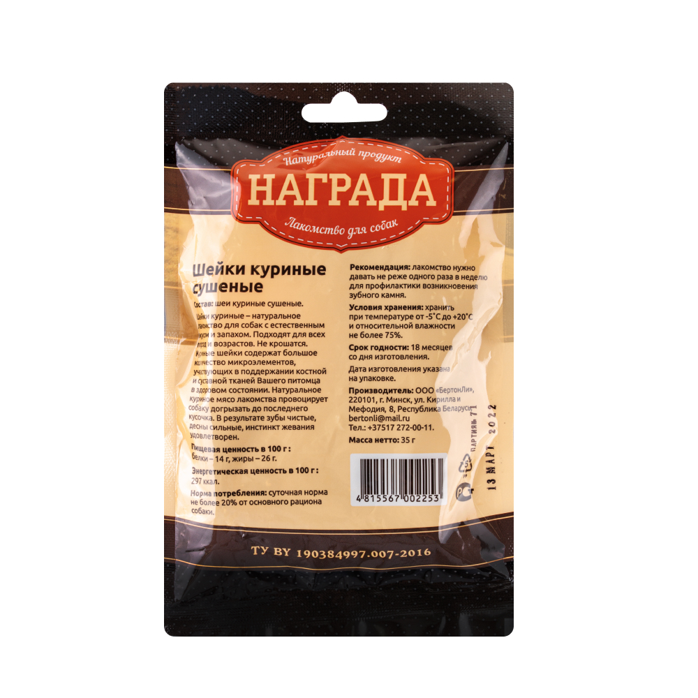 ΠΠ° Π΄Π°Π½Π½ΠΎΠΉ ΡΡΡΠ°Π½ΠΈΡΠ΅ ΡΠ°Π·ΠΌΠ΅ΡΠ΅Π½Ρ ΡΠΎΡΠΎ, ΠΎΠΏΠΈΡΠ°Π½ΠΈΠ΅ ΠΈ ΡΠΎΡΡΠ°Π², Π° ΡΠ°ΠΊΠΆΠ΅ ΠΎΡΠ·ΡΠ²Ρ ΠΎ "ΠΠ°Π³ΡΠ°Π΄Π° ΠΠ°ΠΊΠΎΠΌΡΡΠ²ΠΎ Π¨Π΅ΠΉΠΊΠΈ ΠΊΡΡΠΈΠ½ΡΠ΅ Π΄Π»Ρ ΡΠΎΠ±Π°ΠΊ, 35 Π³Ρ.".