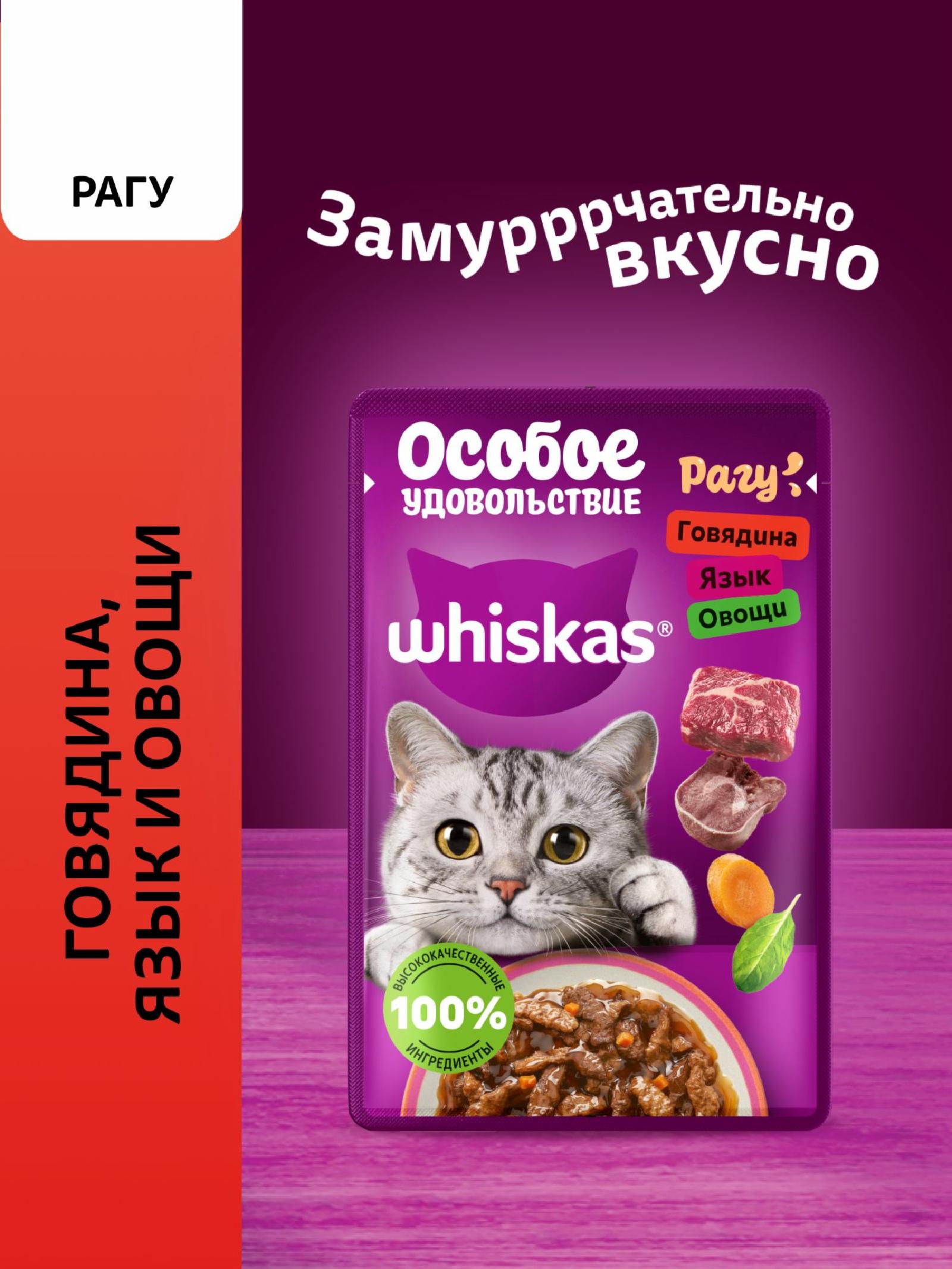 На данной странице размещены фото, описание и состав, а также отзывы о "Консервы, паучи Whiskas Влажный корм «Особое удовольствие» для взрослых кошек рагу с говядиной, языком и овощами (1 шт)".