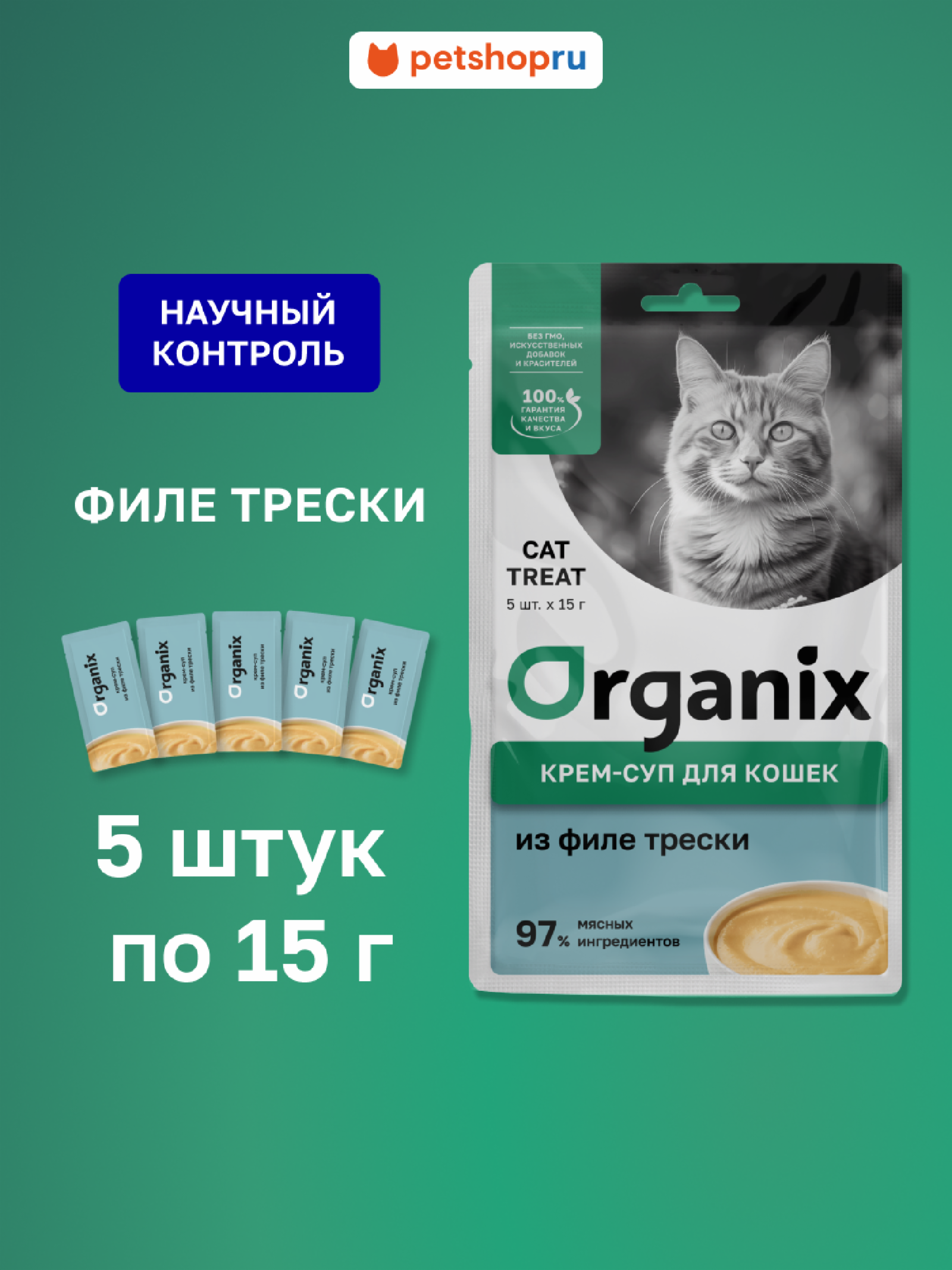 Π₯олистики Organix лакомства ΠšΡ€Π΅ΠΌ-суп для котят ΠΈ кошСк, ΠΈΠ· Ρ„ΠΈΠ»Π΅ трСски (5ΡˆΡ‚ x 15Π³Ρ€)