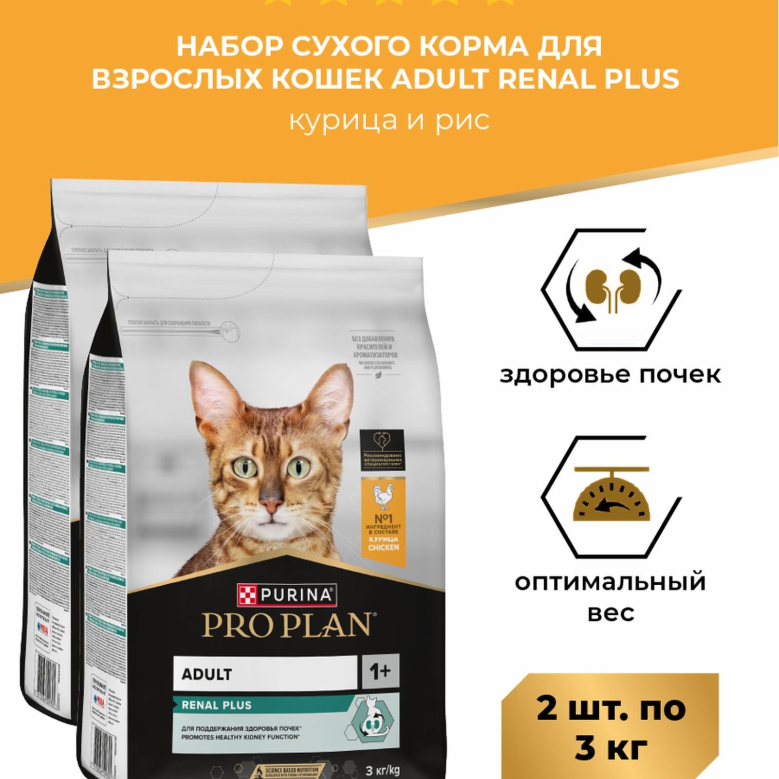 С возрастом кошки подвержены высокому риску возникновения заболеваний почек, которые могут быть вызваны как неправильным питанием, так и внутренними факторами организма. Таким питомцам рекомендован корм с высоким содержанием белка.Команда квалифицированных ветеринарных специалистов разработала рацион PRO PLAN(R) RENAL PLUS для взрослых кошек для поддержания здоровья почек*. Этот сбалансированный полнорационный корм создан с учетом индивидуальных потребностей питомцев и обеспечивает легкую усвояемость питательных веществ.Преимущества:• Разработан на основе научных исследований для поддержания здоровья почек• Поддерживает здоровую иммунную систему благодаря высокому уровню витаминов и антиоксидантов• Содержит оптимальный уровень белка и сбалансированный состав минералов для поддержания здоровых суставов и отличной подвижностиРационы PRO PLAN(R) разработаны на основе современных научных достижений и рекомендованы ветеринарными специалистами**.Корм сухой для кошек PRO PLAN(R) RENAL PLUS (Поддержание здоровья почек) -- это полюбившийся PRO PLAN(R) Original OptiRenal с новым названием, но с прежним составом и качеством.Московская ветеринарная академия им. К. И. Скрябина признаёт экспертизу компании «Нестле» в области кормления домашних животных.Уважаемые клиенты! Обращаем ваше внимание на то, что продукт временно в продаже как в новом, так и в прежнем дизайне упаковки. Поставка осуществляется в зависимости от наличия на складе. Продукт в обновленной упаковке будет введен в оборот на территории РФ до конца 2025 г.* Этот продукт поддерживает здоровье почек кошек. Если вашей кошке нужна дополнительная специализированная поддержка почек, обратитесь к ветеринару.** Рекомендовано большинством опрошенных ветеринарных специалистов, консультирующих и/или дающих рекомендации по кормлению домашних животных, по результатам исследования, проведенного АО "МИЦ", ИНН 7709027118, по заказу ООО "Нестле Россия" в 2024 г. Выборка: 220 человек. География: Россия, города с населением от 500 тыс. чел.