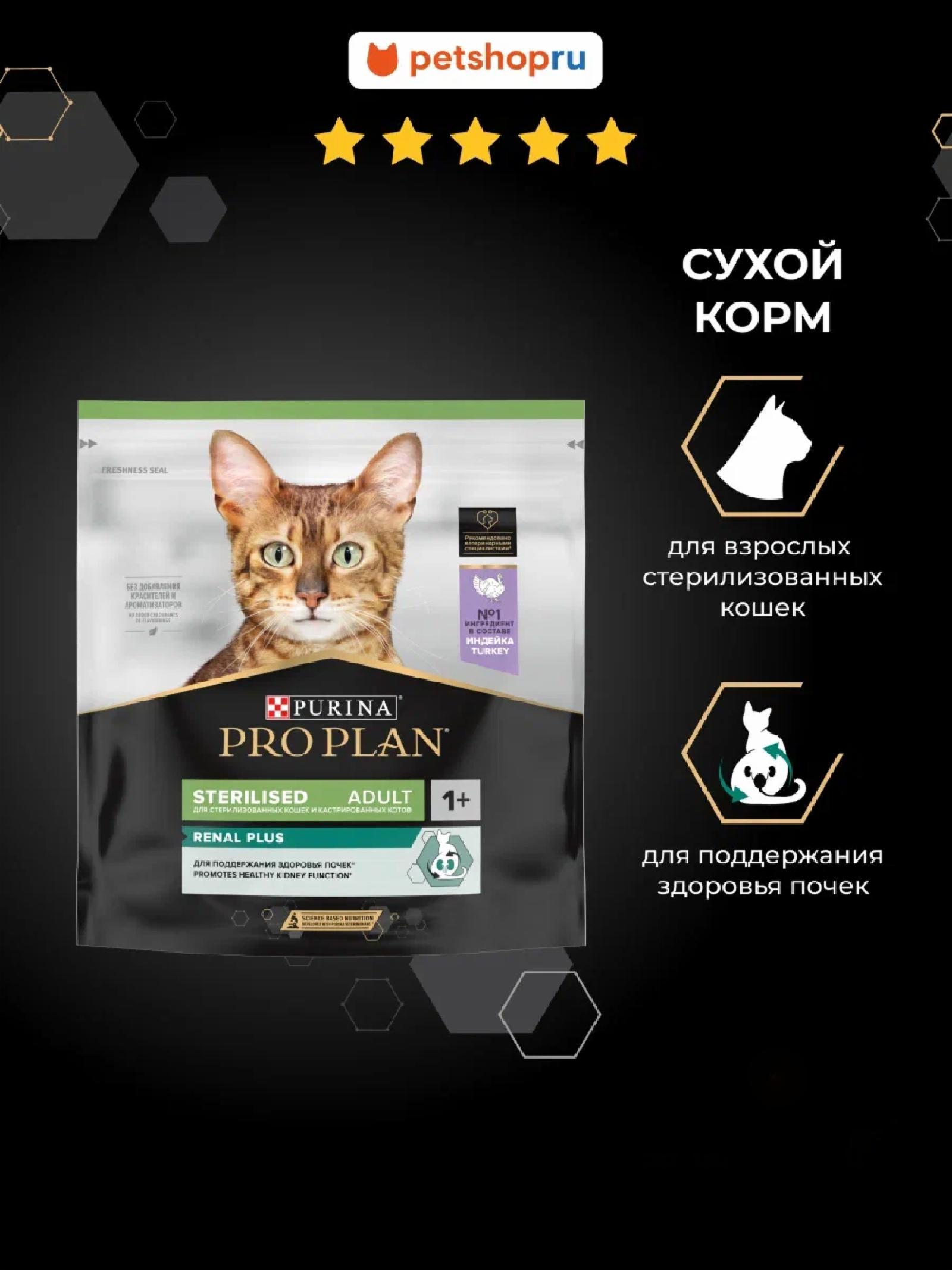 После стерилизации в организме кошек происходит серьезная гормональная перестройка -- повышается риск ожирения и развития проблем с мочевыделительной системой. Стерилизованным питомцам рекомендовано особое питание с пониженным содержанием жиров и углеводов, специально подобранным минеральным составом.  Команда квалифицированных ветеринарных специалистов разработала рацион PRO PLAN(R) Sterilised RENAL PLUS для взрослых стерилизованных кошек для поддержания здоровья почек*. Этот сбалансированный полнорационный сухой корм c высокой вкусовой привлекательностью создан с учетом потребностей питомцев в высококачественном белке, а также витаминах и минералах, важных для здорового функционирования организма. • Снижается воздействие окислительного стресса на почки через шесть недель кормления** • Создан для поддержания здоровья мочевыделительной системы и идеального веса стерилизованных кошек • Помогает защищать зубы питомцев от образования налета и зубного камня  Корм сухой для кошек PRO PLAN(R) Sterilised RENAL PLUS (Поддержание здоровья почек) -- это полюбившийся PRO PLAN(R) Sterilised OptiRenal с новым названием, но с прежним составом и качеством.  Рационы PRO PLAN(R) разработаны на основе современных научных достижений.  Московская ветеринарная академия им. К. И. Скрябина признаёт экспертизу компании «Нестле» в области кормления домашних животных.  Уважаемые клиенты! Обращаем ваше внимание на то, что упаковка может иметь несколько видов дизайна (старый и обновленный). Поставка осуществляется в зависимости от наличия на складе. Продукт в обновленной упаковке будет введен в оборот на территории РФ в период с марта 2023 по декабрь 2024 г.  * Этот продукт поддерживает здоровье почек кошек. Если вашей кошке нужна дополнительная специализированная поддержка почек, обратитесь к ветеринару. ** Внутреннее исследование Purina: Влияние комплекса нутриентов на показатели здоровья почек на 40 кошках в течение 3 месяцев, 2006, Purina R&D Amiens, France.