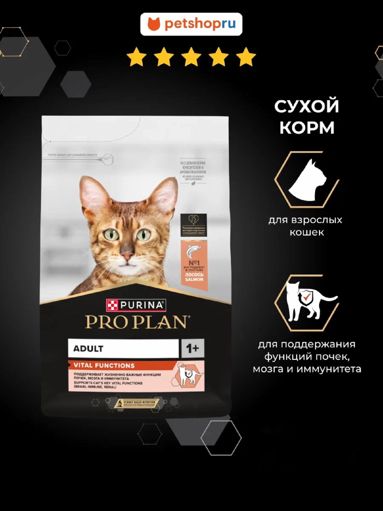 На данной странице размещены фото, описание и состав, а также отзывы о "Сухие корма PRO PLAN® Сухой корм для взрослых кошек, с высоким содержанием лосося, Adult VITAL FUNCTIONS (3 кг)".