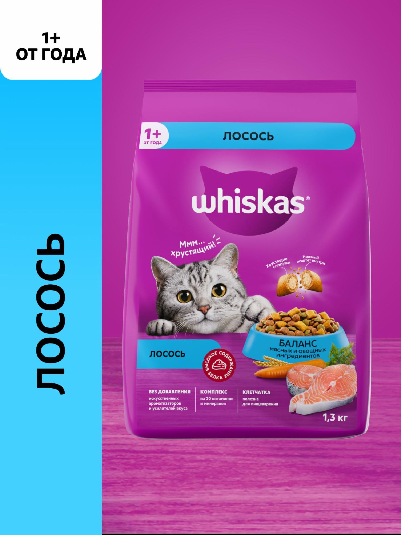 На данной странице размещены фото, описание и состав, а также отзывы о "Сухие корма Whiskas Сухой полнорационный корм для взрослых кошек «Вкусные подушечки с нежным паштетом. Аппетитный обед с лососем», 1.3 кг (1.3 кг)".