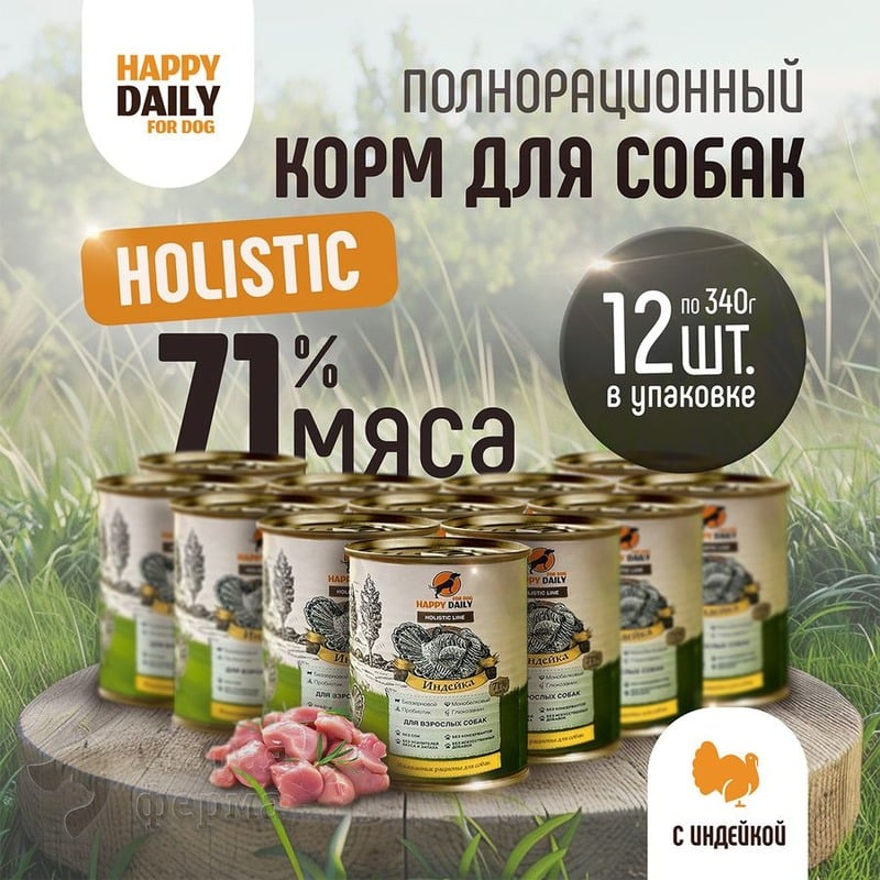 На данной странице размещены фото, описание и состав, а также отзывы о "Happy Daily Holistic line влажный корм для взрослых собак всех пород с ИНДЕЙКОЙ, в консервах - 340 г (6 шт)".
