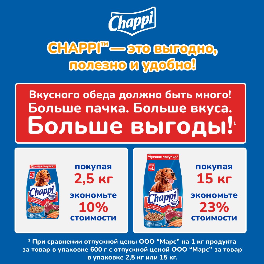 ΠΏΠΎΡΠΎΠ΄ ΠΡΡΠ½ΠΎΠ΅ ΠΈΠ·ΠΎΠ±ΠΈΠ»ΠΈΠ΅, Ρ ΠΎΠ²ΠΎΡΠ°ΠΌΠΈ ΠΈ ΡΡΠ°Π²Π°ΠΌΠΈ, 15 ΠΊΠ³ 2310156" ΠΏΡΠΎΠΈΠ·Π²ΠΎΠ΄ΠΈΡΠ΅Π»Ρ "Chappi", ΠΏΠΎ ΡΠ΅Π½Π΅ 3 347 β½ Π² Π·ΠΎΠΎΠΌΠ°Π³Π°Π·ΠΈΠ½Π΅ "Fraulen" Π² ΠΌΠ°Π³Π°Π·ΠΈΠ½Π΅ ΠΈΠ»ΠΈ Ρ Π΄ΠΎΡΡΠ°Π²ΠΊΠΎΠΉ Π½Π° Π΄ΠΎΠΌ Π² Π³ΠΎΡΠΎΠ΄Π΅ ΠΠΎΡΠΊΠ²Π°.
