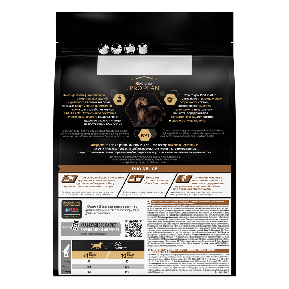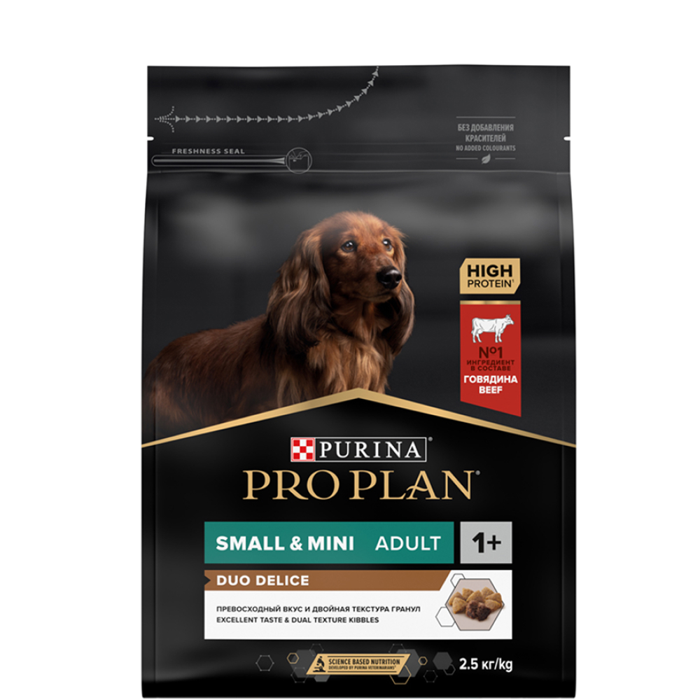 На данной странице размещены фото, описание и состав, а также отзывы о "ProPlan Duo Delice Сухой корм с двойной текстурой гранул для взрослых собак мелких и карликовых пород, с высоким содержанием говядины, 2,5 кг".
