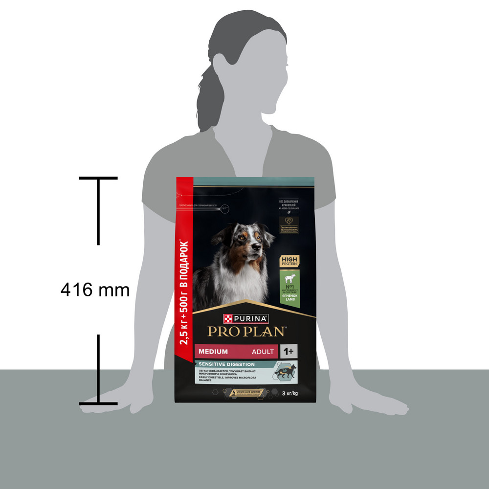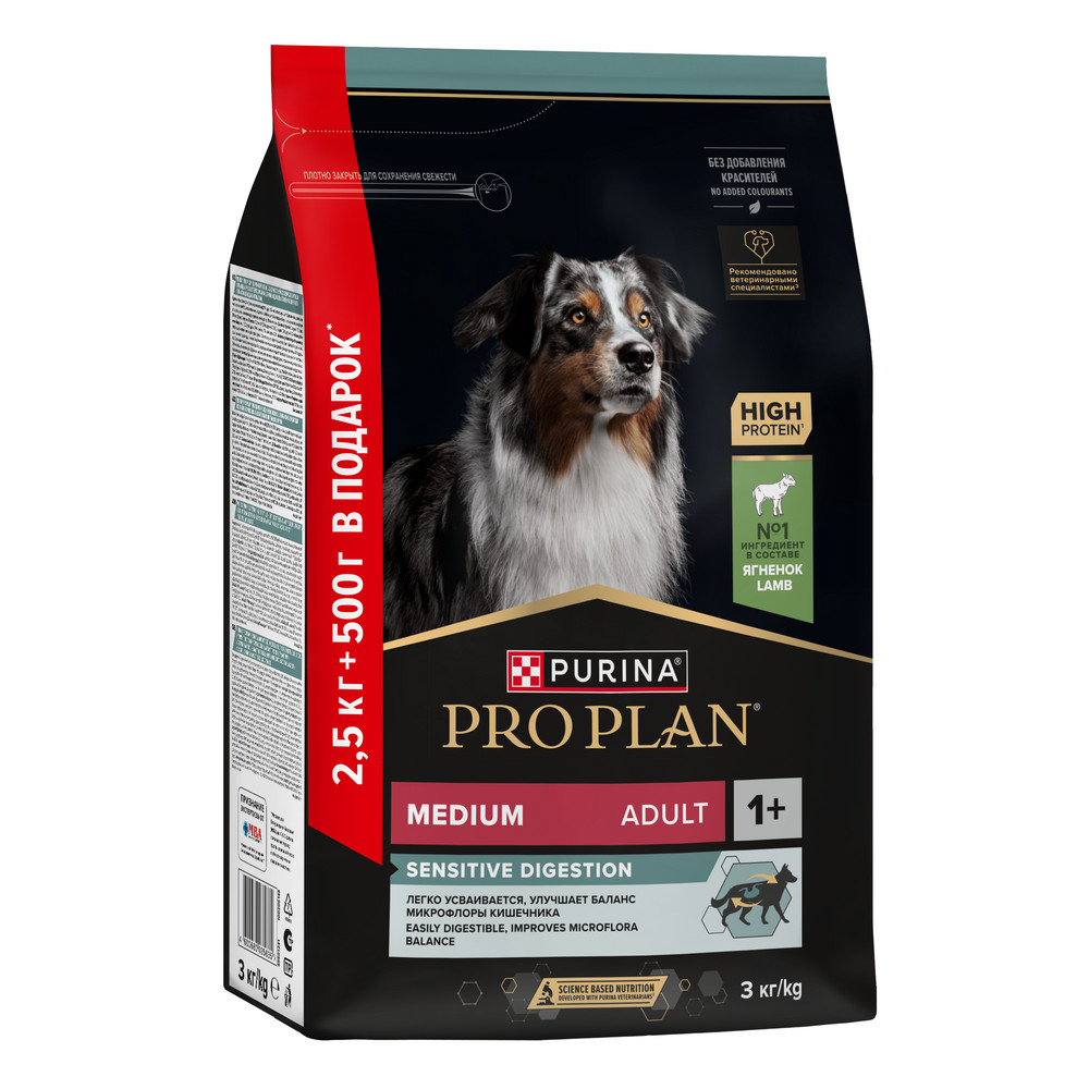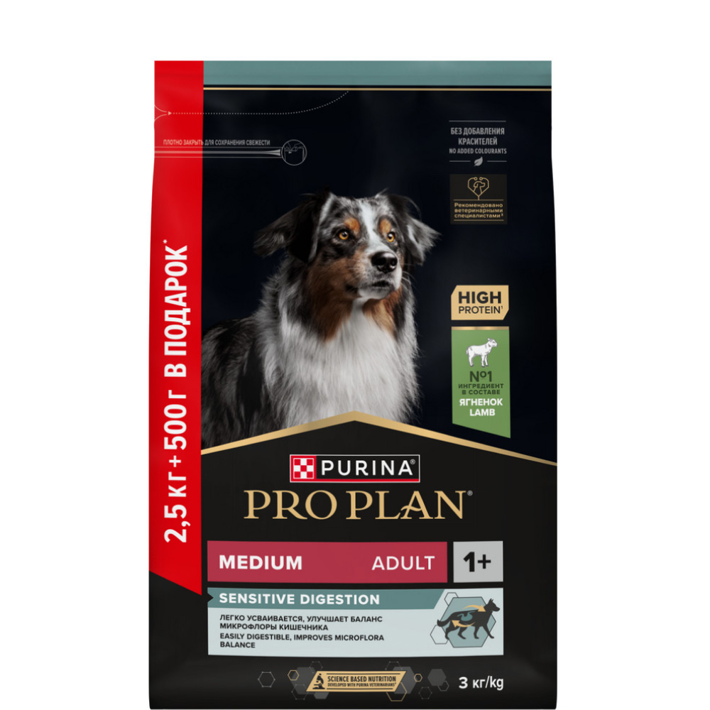 На данной странице размещены фото, описание и состав, а также отзывы о "ProPlan Sensitive Digestion Сухой корм для взрослых собак средних пород с чувствительным пищеварением, с ягненком, 2,5 кг + 500 гр. в подарок".