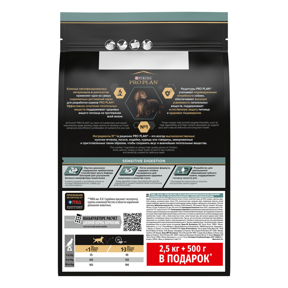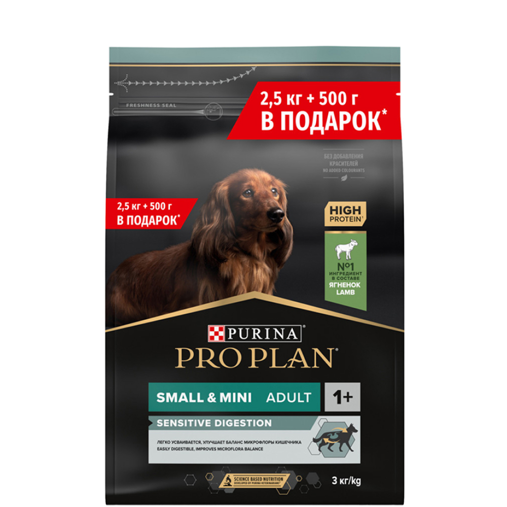 На данной странице размещены фото, описание и состав, а также отзывы о "ProPlan Сухой корм для взрослых собак мелких и карликовых пород с чувствительным пищеварением, с высоким содержанием ягненка, 2,5 кг + 500 гр. в подарок".